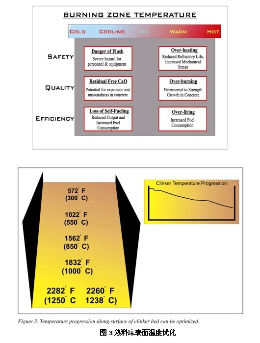 二、Spyrometer系統(tǒng)在冷卻器上的應(yīng)用 冷卻器上安裝Quadtek Spyrometer系統(tǒng)通過它的視頻成像可以時(shí)時(shí)再現(xiàn)冷卻器的真實(shí)情況,增加操作人員對篦下壓力的情況掌握。他們不再擔(dān)心堵塞現(xiàn)象的發(fā)生,可以自信的增加熟料層的厚度?梢蕴峁骼錂C(jī)和回轉(zhuǎn)窯的效率,不會(huì)擔(dān)心造成停窯的情況。Quadtek Spyrometer系統(tǒng)提供了解決效率與可靠性這對矛盾需要掌握的信息。 Quadtek Spyrometer系統(tǒng)在應(yīng)用中的最大貢獻(xiàn)就是給操作人員帶來的自信和產(chǎn)生的效益。Spyrometer系統(tǒng)可以檢測篦上熟料層的表面溫度。根據(jù)溫度,操作人員可以調(diào)節(jié)風(fēng)機(jī)的風(fēng)量,這樣,熟料的冷卻和熱能的回收就可以得到優(yōu)化,沒有Quadtek Spyrometer系統(tǒng)就無法做到這一點(diǎn)。 對一座3000噸/天的水泥窯而言,按1%的燃料節(jié)約比例計(jì)算,不到一年即可收回投資成本。在給操作工提供的信息和帶來的自信心的共同作用下,通過增加熟料層的厚度和優(yōu)化風(fēng)機(jī)的風(fēng)量調(diào)節(jié),燃料的節(jié)約比例要大于1%。Quadtek Spyrometer系統(tǒng)的應(yīng)用會(huì)帶來可觀的回報(bào)。 此外,該系統(tǒng)還可以帶來無法量化的好處。通過對熟料冷卻的優(yōu)化,可以減少熾熱熟料運(yùn)出冷卻器造成意外的發(fā)生。高溫熟料意味著人身安全隱患和橡膠皮帶機(jī)的火災(zāi)隱患。高溫熟料還會(huì)影響粉磨站的研磨效率。