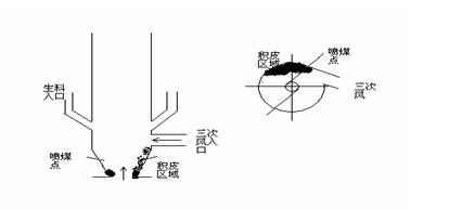 表1 煤的工業(yè)分析 分解爐錐部、縮口、三次風(fēng)進(jìn)風(fēng)口結(jié)料嚴(yán)重(見圖1),分解爐出口負(fù)壓從正常時的-1000Pa升至-1500Pa,嚴(yán)重影響了窯內(nèi)通風(fēng)。 (2)系統(tǒng)漏風(fēng)嚴(yán)重。其中包括窯尾密封圈漏風(fēng)、煙室清料口變形漏風(fēng)、分解爐與煙室連接處膨脹節(jié)漏風(fēng)等,相對減小了窯內(nèi)通風(fēng)量,漏風(fēng)處也容易形成結(jié)皮。 3采取的措施和效果 ------------------------------------------------------------------------------------------------